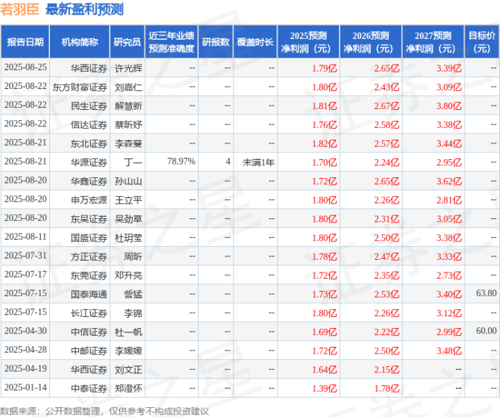 证券之星数据中心根据近三年发布的研报数据计算,华源证券丁一研究员团队对该股研究较为深入,近三年预测准确度均值为78.97%,其预测2025年度归属净利润为盈利1.7亿,根据现价换算的预测PE为81.09。