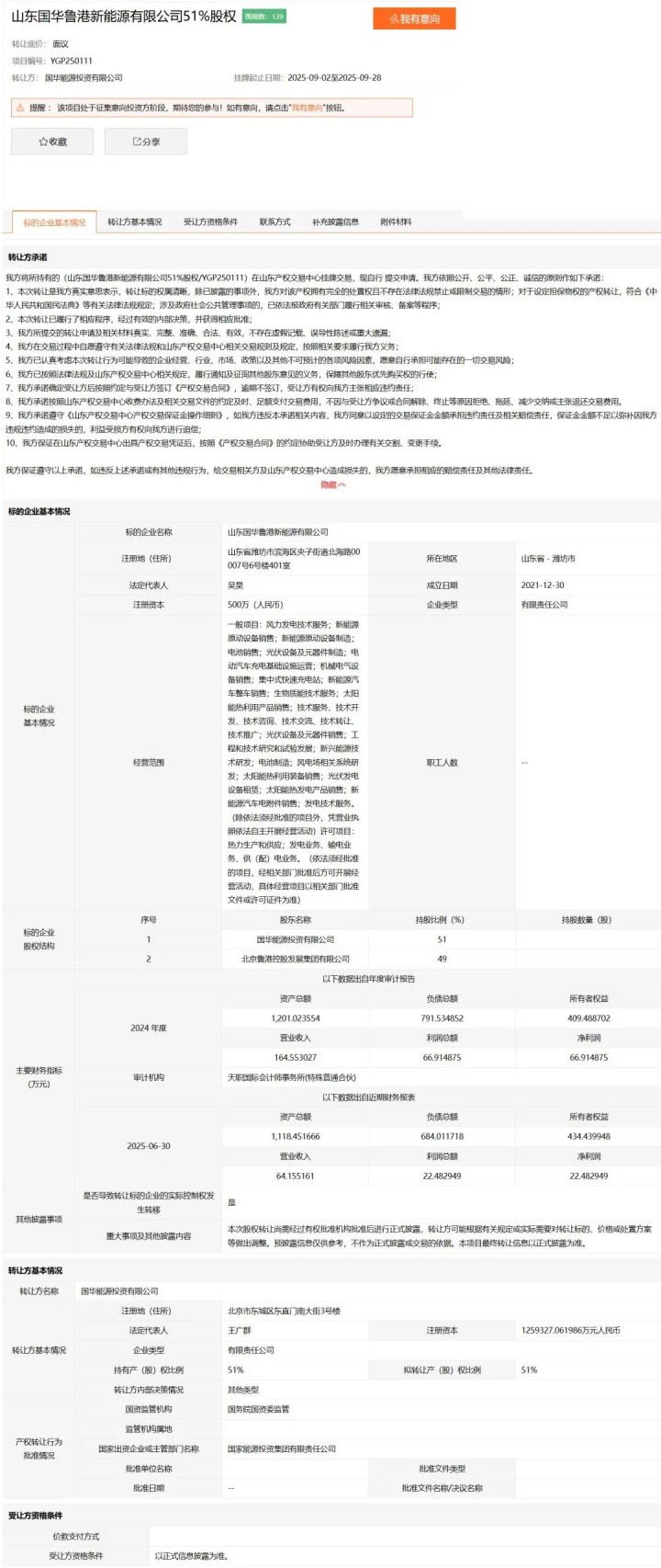 9月2日,国华能源投资有限公司挂牌转让山东国华鲁港新能源有限公司51%股权。